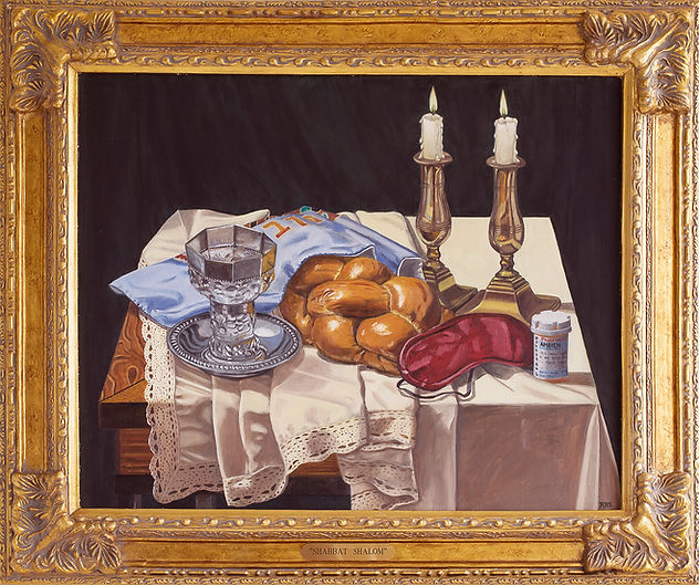This painting puts a playful twist on a traditional Shabbat scene. Having a mandatory day of rest is easier said than done in modern times, as expressed by incorporating the Ambien and sleeping mask.